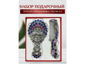 Набор Зеркало для макияжа и расческа в винтажном стиле серебристый с сине-фиолетовой эмалью 103563700145