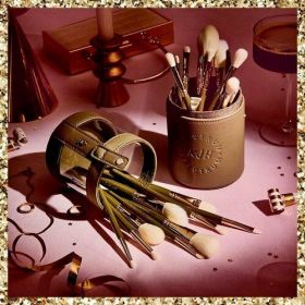 Уложенные в премиальный чехол из веганской кожи, который также может служить столиком для макияжа или хранения, чехол можно протирать, и у него двойная подкладка, предлагая исключительное качество с деталями с логотипом.