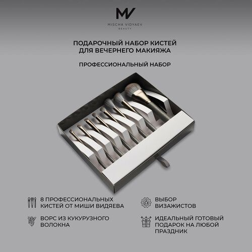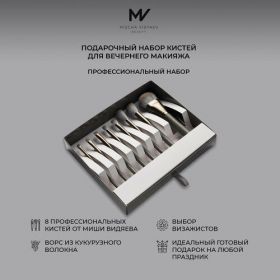 Представляем вам наш волшебный набор кистей от Миша Видяев для создания вечернего макияжа DAZZLING DRAMA от Mischa Vidyaev Beauty. Он включает в себя все необходимые инструменты: для пудры, для тонального крема, румян, теней, хайлайтера, контуринга и других косметических продуктов. С помощью них вы сможете легко и быстро создать и нанести сложный макияж, подчеркнуть скулы или, например, выделить глаза. Ворс из кукурузного волокна обеспечивает ровное и равномерное нанесение косметики, а удобные ручки делают процесс нанесения макияжа максимально комфортным. Все формы кисти подобраны и разработаны персонально химиком-технологом бренда Мишей Видяевым и лично протестированы, что говорит о высоком качестве продукта. В состав набора входят разные формы кистей: большая приплюснутая кисть, которая отлично подойдет для кремовых текстур; скошенная пушистая - для нанесения пудры, румян и других сухих текстур; факелообразная - отлично подойдет для бронзера и хайлайтера; плоская пушистая кисть, которой можно распределить тени; кисть-бочонок - идеальная как для растушевки теней, так и нанесения помады и тинтов и плоские для подводок, теней и карандашей для глаз. Кисти универсальны и подойдут как для домашнего использования любителям макияжа и косметики, так и профессиональным визажистам для работы в студии. Их уже выбирают именитые мастера макияжа и остаются в восторге. Кисти Misha Vidyaev Beauty сразу идут в красивой подарочной коробке. Они станут отличным подарком для любой дамы, которая следит за своим внешним видом. Подарите радость и красоту своим близким с помощью нашего профессионального набора кистей для макияжа. Создавайте уникальные образы с легкостью и наслаждайтесь идеальным результатом каждый день