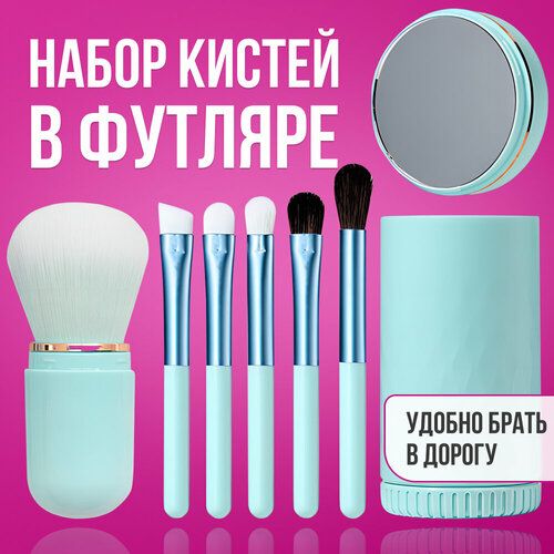 НАЙТИ ВЫГОДНЕЕ - Кисти косметические для макияжа, футляр с зеркалом набор 6шт голубые, кисть для пудры, консилера, теней, бровей, помады