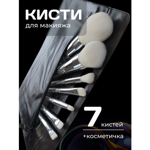 Кисти для макияжа набор 7 штук, серебристые с косметичкой в комплекте
