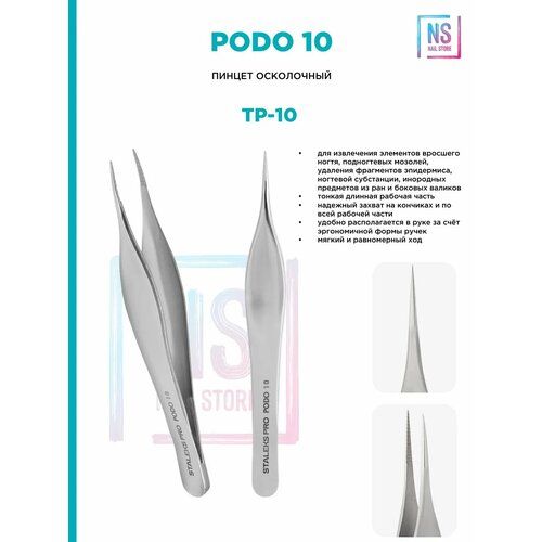 Пинцет осколочный STALEKS PRO PODO 10 (TP-10). Пинцет имеет тонкие и длинные рабочие части с насечками, которые надежно захватывают и удерживают даже самые мелкие части ногтевой пластины, подходит для удалениях мелких фрагментов эпидермиса, ногтевой субстанции, инородных предметов из ран или боковых валиков. Для извлечения элементов вросшего ногтя, подногтевых мозолей, удаления фрагментов эпидермиса, ногтевой субстанции, инородных предметов из ран и боковых валиков.