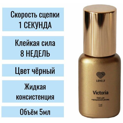 Клей для наращивания ресниц «Victoria» входит в «королевскую» серию клеев Lovely. При производстве клея «Victoria» было использовано сырье наивысшего качества, за счет этого клей обладает высокой скоростью сцепки – 1 секунда и максимальной клейкой силой – до 8 недель носки наращенных ресниц. Клей имеет жидкую консистенцию, минимум испарений, устойчив к изменениям внешних условий (t° воздуха, влажность).«Victoria» отличается от других клеев Lovely особенным премиальным дизайном упаковки: благородный золотой цвет, стильная форма флакона дополнительно подчеркивают высокий уровень клея. Клей «Victoria» представлен в объемах – 2 мл, 5 мл и 10 мл. Подходит для мастеров с большим опытом работы. Небольшое количество клея налейте на предназначенную для этого поверхность (палетку для клея Lovely, нефритовый камень Lovely) и обмакните ресницу в каплю клея. Перед применением клей необходимо взболтать в горизонтальной плоскости, а после использования промокнуть носик безворсовой салфеткой в целях предотвращения его засорения. После вскрытия рекомендуется хранить клей строго в вертикальном положении. При проведении процедуры лучше использовать временную пробку. В случае засорения замените носик на новый. Оптимальные условия для работы с клеем:– температура от +18 до +24 °С– влажность воздуха от 40 до 70. Условия хранения: в недоступном для детей месте, вдали от огня и прямых солнечных лучей. Рекомендуемая температура хранения: от 0 до +5 °С. Срок годности с даты производства: 6 месяцев. Срок годности после вскрытия: 2 месяца.