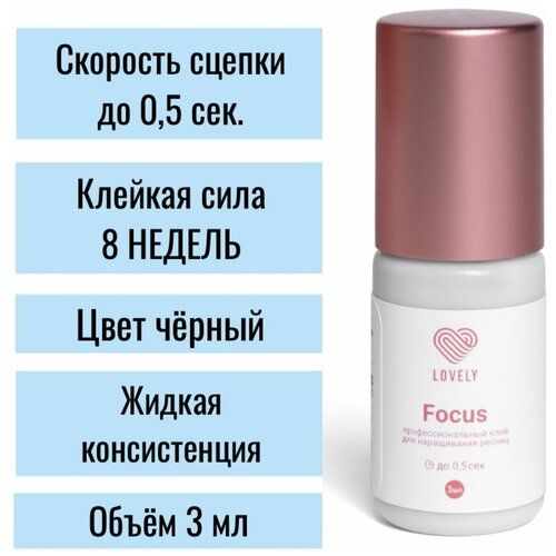 Клей для наращивания ресниц «Focus» – абсолютно новый клей Lovely, который работает супербыстро даже в условиях пониженной влажности. Благодаря улучшенной формуле скорость сцепки составляет меньше 0,5 секунды, а срок носки ресниц достигает 8 недель черный