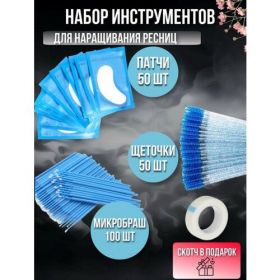 Набор для наращивания ресниц, в котором собраны все самые необходимые расходные материалы для наращивания, ламинирования и укрепления ресниц. Набор для ламинирования ресниц подойдёт как для начинающих, так и для профессиональных опытных лэшмейкеров и бровистов, визажистов. Наши патчи для наращивания ресниц изготовлены из высококачественных и гипоаллергенных материалов. Они хорошо фиксируются на коже, а также легко снимаются, убирают отеки под глазами. Простые и удобные в работе. Микробраши - расходный и незаменимый материал в работе мастера лэшмейкера и бровиста. Их можно использовать как при наращивании, так и при окрашивании ресниц. На конце микробраша, мягкая гипоаллергенная щетинка, которая не позволяет травмировать кожу и ресницы. Браши - незаменимый инструмент в арсенале профессиональных визажистов. Наши микробраши сделаны из высококачественных материалов - не осыпаются и не ломаются. Щеточки для бровей и ресниц применяются для расчесывания и разделения волосков (ресниц и бровей). Щетинки выполнены из высококачественного материала, они не вредят структуре волоса и коже век. Бумажный скотч для защиты и фиксации кожи век, он же трафарет для стрелок, макияжа век и подводки глаз - в подарок. Расходники для наращивания ресниц можно использовать как в домашних условиях, так и в салоне красоты. Наш набор, прекрасно дополнит вашу косметичку. Набор для наращивания ресниц прекрасно подойдет в подарок девушке мастеру по наращиванию ресниц, бровисту, на день рождения, девушке с нарощенными ресницами. Комплектация: микробраши - 100шт, нейлоновые щеточки для расчесывания бровей и ресниц - 50шт, гидрогелевые патчи - 50 пар, бумажный скотч.