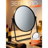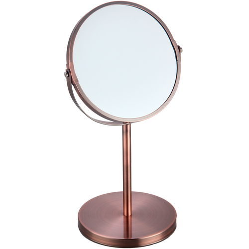 - Зеркало 2-х стороннее настольное, диаметром 17 см, круглой формы, на подставке диаметром 15 см. - Поворачивается на 360 градусов. - Одна из сторон с 3 (трёх) кратным увеличением, а вторая стандартная без геометрических искажений. - Подставка и держатель зеркала прикручиваются болтами к стойке-ножке (16,5 см), с внутренней стороны подставка имеет утяжелитель для устойчивости. - Высота зеркала в собранном виде 34,5 см. - Материал изделия – стекло, сталь с бронзированным покрытием, фактура – матовая. - Размер 18.5 х 15 х 34,5 см.