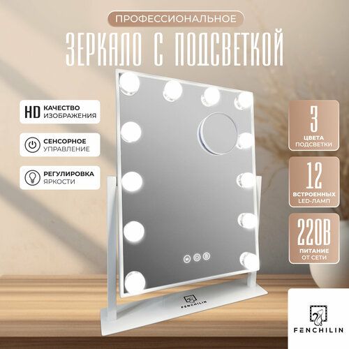 НАЙТИ ВЫГОДНЕЕ - Зеркало с подсветкой для макияжа настольное 41х30 см FENCHILIN модель DC-117 серия Hollywood, белое