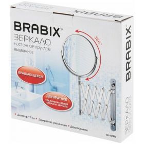 Зеркало BRABIX 607420 Зеркало настенное BRABIX, диаметр 17 см, двусторонее, с увеличением, нержавеющая сталь, выдвижное (гармошка), 607420Настенное двустороннее зеркало BRABIX станет отличным помощником в уходе за кожей, нанесении макияжа, проведении лечебных процедур для лица. Эффект 2-х кратного увеличения позволит тщательно и аккуратно произвести самые сложные манипуляции в макияже. Также удобно для использования во время бритья. Зеркало поворачивается вокруг своей оси, что создает дополнительные удобства при использовании. Оправа выполнена из хромированной стали. Диаметр зеркала составляет 17 см. Условия хранения: хранить при комнатной температуре. Избегать попадания прямых солнечных лучей. Тип размещения: настенное. Форма: круглая. Высота: 17 см. Ширина: 17 см. Двухстороннее: да. С увеличительным эффектом: да. Выдвижное: да. Вращающееся: да. Материал оправы: хромированная сталь. Цвет оправы: серебристый Бренд - BRABIX. Производитель - Китай. . Штрихкод - 4606224302089Характеристики упаковки: Вес: 0,6900 кг. Объем: 0,0021 м3. Размеры: 4x19x20 см.