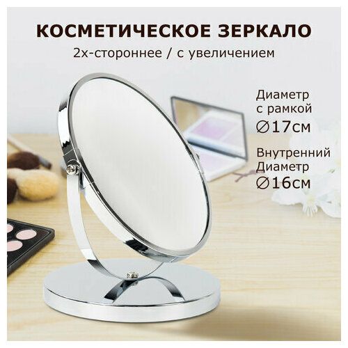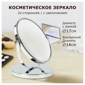 Эффект увеличения позволит тщательно и аккуратно произвести самые сложные манипуляции в макияже. Также удобно для использования во время бритья. Зеркало поворачивается вокруг своей оси, что создает дополнительные удобства при использовании. Оправа выполнена из хромированной стали. Диаметр зеркала составляет 17 см.