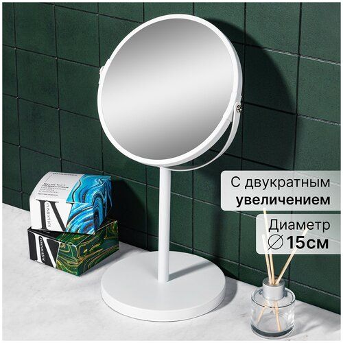 Двустороннее зеркало на подставке имеет сторону со стандартным отражением и сторону с двукратным увеличением. Диаметр зеркала 17 см, высота изделия 34,5 см. Угол наклона регулируется. Органайзер выполнен из металла. Настольное зеркало станет функциональным аксессуаром и стильным дополнением интерьера. Компактное зеркальце на высокой ножке можно разместить на туалетном столике в спальне или ванной комнате. Для женщин косметическое зеркало станет удобным помощником при ежедневном туалете, нанесении макияжа и использовании косметики. Мужчинам зеркало подойдет для бритья. Также удобно использовать визажистам на макияжном столике или гримерам на гримерном столе. Поставляется в стильной картонной упаковке. Для сборки требуется крестовая отвертка. Декоративное круглое зеркало с увеличительной стороной сможет стать удобным дополнением вашего дома, стильным интерьерным декором или приятным подарком для родных и близких.