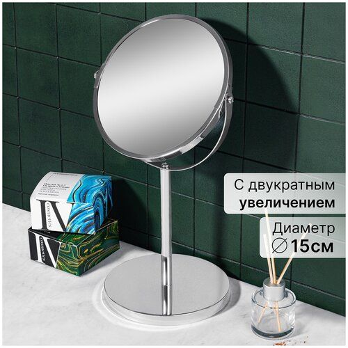 Двустороннее зеркало на подставке имеет сторону со стандартным отражением и сторону с двукратным увеличением. Диаметр зеркала 17 см, высота изделия 34,5 см. Угол наклона регулируется. Органайзер выполнен из металла. Настольное зеркало станет функциональным аксессуаром и стильным дополнением интерьера. Компактное зеркальце на высокой ножке можно разместить на туалетном столике в спальне или ванной комнате. Для женщин косметическое зеркало станет удобным помощником при ежедневном туалете, нанесении макияжа и использовании косметики. Мужчинам зеркало подойдет для бритья. Также удобно использовать визажистам на макияжном столике или гримерам на гримерном столе. Поставляется в стильной картонной упаковке. Для сборки требуется крестовая отвертка. Декоративное круглое зеркало с увеличительной стороной сможет стать удобным дополнением вашего дома, стильным интерьерным декором или приятным подарком для родных и близких.