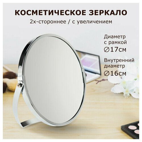 Эффект увеличения позволит тщательно и аккуратно произвести самые сложные манипуляции в макияже. Также удобно для использования во время бритья. Зеркало поворачивается вокруг своей оси, что создает дополнительные удобства при использовании. Оправа выполнена из хромированной стали. Диаметр зеркала составляет 17 см.