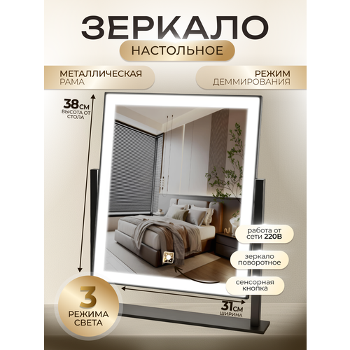 Зеркало с подсветкой - это стильный и функциональный аксессуар, который поможет вам создавать безупречный макияж. Его можно разместить в спальне или ванной комнате, в детской комнате. Прямоугольное черное зеркало на туалетный столик выполнено из металла. Мощность подсветки 8 w. Работает от сети 220В. Имеет три режима освещения. Переключение режимов и регулировка яркости происходит благодаря сенсорной кнопке на самом зеркале. Настольное зеркало на подставке станет функциональным аксессуаром и стильным дополнением интерьера дома и студии красоты. Маленькое зеркало размерами 27х33 см, позволяет вам рассмотреть каждую деталь вашего внешнего вида в наилучшем свете.
