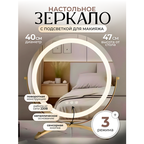 НАЙТИ ВЫГОДНЕЕ - Зеркало настольное для макияжа, с подсветкой, круглое, металл, 40см, золотистое