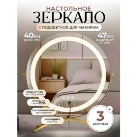 Круглое зеркало настольное с подсветкой станет идеальным аксессуаром для создания уютной атмосферы в спальне, ванной или на туалетном столике. Это изделие привносит стиль в интерьер и удобство в повседневные процедуры. Удобная LED подсветка помогает легко наносить макияж и делать точные косметические коррекции. Имеет три режима и регулировку яркости. Режимы освещения дают возможность выбрать наиболее подходящий вариант для любого времени суток. Визуально увеличивает пространство и добавляет света в помещение, что особенно важно для небольших комнат. Качественная металлическая конструкция на ножке обеспечивает устойчивость. Диаметр данного зеркала составляет 40 см. Работает от сети 220 В. Настольное большое зеркало с подсветкой легко разместить на столе или полке.