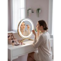 Круглое зеркало настольное с подсветкой станет идеальным аксессуаром для создания уютной атмосферы в спальне, ванной или на туалетном столике. Это изделие привносит стиль в интерьер и удобство в повседневные процедуры. Удобная LED подсветка помогает легко наносить макияж и делать точные косметические коррекции. Имеет три режима и регулировку яркости. Режимы освещения дают возможность выбрать наиболее подходящий вариант для любого времени суток. Визуально увеличивает пространство и добавляет света в помещение, что особенно важно для небольших комнат. Качественная металлическая конструкция на ножке обеспечивает устойчивость. Диаметр данного зеркала составляет 40 см. Работает от сети 220 В. Настольное большое зеркало с подсветкой легко разместить на столе или полке.