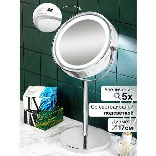Двустороннее круглое зеркало от ELCASA имеет сторону со стандартным отражением и сторону с пятикратным увеличением. Общий размер изделия с подставкой – 20,5х13,5х36 см, размер подставки – 13,5х13,5х1,5 см. Длина ножки – 15 см (не регулируется по высоте). Диаметр зеркальной поверхности – 17,5 см. Угол наклона регулируется, декоративное зеркальце вращается на 360 градусов. Ободок оснащён подсветкой, благодаря чему изделие можно использовать без настольной лампы. Регулируется кнопочным переключателем. Работает от 4 батареек формата ААА (не входят в комплект). Увеличивающая сторона обеспечит удобство при проведении косметических процедур. Компактное настольное зеркальце изящного оттенка хром станет функциональным аксессуаром и стильным дополнением вашего дома. Разместите его на туалетном столике или полке в своей спальне или ванной комнате. Поставьте на тумбочку рядом с косметическими принадлежностями, чтобы держать всё необходимое под рукой. Зеркальце станет помощником при ежедневном туалете, нанесении макияжа или масок для лица. Мужчинам подойдёт для бритья. Универсальный аксессуар будет удобным элементом инвентаря визажистов и гримёров. Не рекомендуется применять абразивные моющие средства. Поставляется в дизайнерской картонной коробке – благодаря ей вам не потребуется дополнительная подарочная упаковка. Крутящееся зеркало станет отличным подарком для женщин и мужчин, а универсальный дизайн впишет его в любой интерьер. Двустороннее зеркальце с увеличительной стороной от бренда элькаса послужит стильным элементом декора для интерьера вашего дома и поможет поддерживать вашу красоту в течение дня