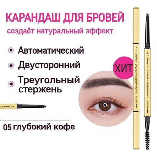 НАЙТИ ВЫГОДНЕЕ - Карандаш для бровей автоматический, двусторонний, треугольный, в золотистом корпусе. Глубокий кофе
