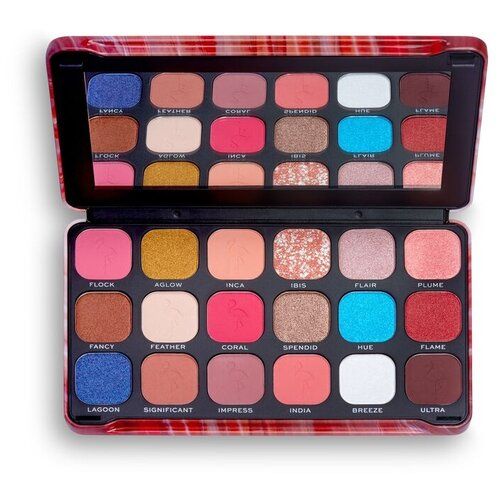 Будь прекрасным фламинго в стае голубей Жестяной футляр палетки REVOLUTION Makeup Forever Flawless Flamboyance Flamingo с принтом оперения птицы — дитя заката скрывает восемнадцать ярких оттенков и большое, удобное зеркало. Персиковые и розовые тона в ней дополнены сдержанными лиловыми и коричневыми, а также контрастными синим и бирюзовым акцентами. Шелковистая текстура теней легко наносится и растушевывается, позволяя добиться плавных переходов цвета, а гармонично подобранные оттенки идеально сочетаются друг с другом и вдохновляют на создание ярких образов. В палетку вошли 8 оттенков с матовым финишем и 10 - с частицами шиммера. Не тестируется на животных. Подходит для веганов.