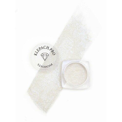 Универсальный бело-голубой искрящийся пигмент. На черной гелевой подводке пигмент мерцает ярким лазурным блеском. На праймере Klepach. Pro- бело-голубое сияние. Для плотного нанесения используйте кисть KLEPACH. PRO E18, для мелких участков E19. Структура пигмента-искры.