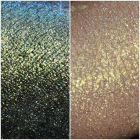 Универсальный хамелеон, экстравагантных вечерних макияжей. На черной гелевой подводке красиво переливается ярко-зеленым, изумрудным, голубым. На праймере Klepach. Pro - полупрозрачный с ярким желто-зеленым сиянием. Структура пигмента- звездная пыль.