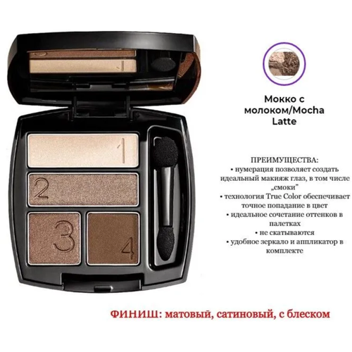 Тени для век четырехцветные Безупречный цвет Мокко с молоком / Mocha Latte - это один из самых важных элементов макияжа, который помогает создать яркий и выразительный образ. Они используются для придания глазам глубины, яркости и сияния. Сегодня на рынке косметики представлено огромное количество теней для век различных оттенков, текстур и эффектов.