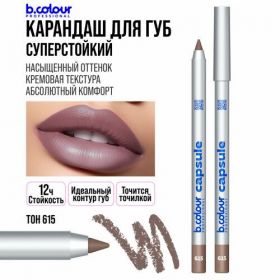 Карандаш для губ B.COLOUR PROFESSIONAL CAPSULE Карандаш 615 Тот самый идеальный, универсальный, холодный бежево-коричневый нюд с серо-тауповым подтоном «taupe nude графитовый нюд» который в тренде. Стильный, трендовый, элегантный оттенок, идеально подходит для скульптурирования контура губ. Идеален для fashion-образов и нестандартных контуров, сочетается с помадами и блесками в нюдовой, кофейной и карамельной гамме. Карандаш для губ стойкий создает 100% идеальный макияж губ со стойкостью до 12 часов. Тон 615 - холодный бежево-тауповый нюд с мягким серым подтоном.