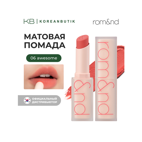 - Самая продаваемая матовая помада rom&nd в новом дизайне упаковки, подходящая как для теплых, так и для холодных тонов.