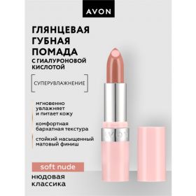Глянцевая губная помада с гиалуроновой кислотой Avon СуперУвлажнение тон Нюдовая классика. Глянцевая помада с гиалуроновой кислотой - это настоящий подарок для губ. Благодаря глянцевому финишу помада выглядит стильно и элегантно, придавая образу особую изысканность. Гиалуроновая кислота в составе помады увлажняет губы, делая их мягкими и ухоженными. Такая помада не только красиво смотрится, но и заботится о здоровье губ, защищая их от обезвоживания и шелушения. При использовании помады с гиалуроновой кислотой Вы получаете не только насыщенный цвет и долговременное покрытие, но и уход за нежной кожей губ. Формат: помада в стике. Покрытие: плотное. Преимущества: гиалуроновая кислота и глицерин для мгновенно увлажненных и гладких губ, стойкий насыщенный глянцевый финиш, комфортная бархатная текстура, которая не сушит губы, 50% увлажняющих и защитных ингредиентов, которые питают губы и ухаживают за ними. Способ применения: Стиком помады или плоской кистью для макияжа губ нанеси помаду, очерчивая контур губ. Затем нанеси помаду на губы, двигаясь от центра к уголкам губ. Для максимальной стойкости промокни уже накрашенные губы салфеткой и нанеси еще один слой помады. Для создания более четкого контура губ предварительно нанеси карандаш для губ: обведи контур и затем заполни губы карандашом полностью, с ним помада будет держаться дольше и не растечется. Чтобы создать растушеванный контур, нанеси и растушуй помаду пушистой кистью для теней или пальцем.