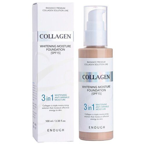 Тональный крем для лица Enough Collagen Whitening Moisture Foundation 3 In 1 обладает легкой текстурой, насыщенной пигментом, за счет чего создается невесомое пигментированное покрытие, которое с легкостью маскирует любые несовершенства кожи, придавая лицу свежий, отдохнувший и сияющий вид. Коллагеновый тональный крем выравнивает рельеф кожи, маскируя расширенные поры, создает ровное, идеально гладкое и стойкое покрытие, не утяжеляя макияж, не создавая эффекта маски или пленки на лице, не провоцируя воспалительных процессов и закупорку пор.