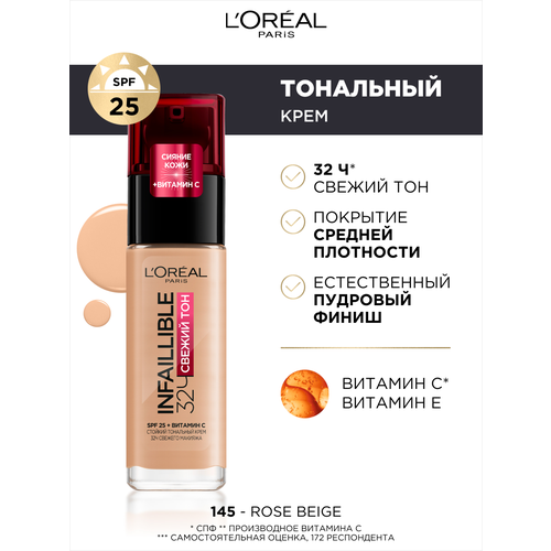 НАЙТИ ВЫГОДНЕЕ - L'Oreal Paris, Стойкий тональный крем INFAILLIBLE СВЕЖИЙ ТОН с UV-защитой, оттенок 145, SPF 25, 30 мл