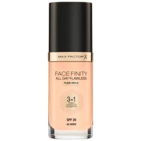 Max Factor Facefinity All Day Flawless 3 в 1 — это жидкая Тональная основа, сочетающая в себе праймер и консилер, которая создает стойкое и безупречное покрытие. Формула: Улучшенная Эмульсия на основе воды и силикона обеспечивает качественное покрытие и легко наносится благодаря специальной формуле, поэтому теперь сделать профессиональный макияж очень просто. Праймер выравнивает поверхность кожи и обеспечивает стойкость макияжа, а консилер маскирует недостатки и изъяны, придавая лицу безупречный вид. Легкая формула Max Factor Facefinity, содержащая солнцезащитный фактор SPF 20 для защиты кожи от солнечных лучей, предотвращает появление жирного блеска, поскольку в состав не входят масла. Советы визажиста: Идеальный оттенок должен соответствовать тону кожи на линии подбородка. Для получения ровного покрытия нанесите небольшое количество тональной основы на лицо и распредели ее от центра к краям кончиками пальцев или с помощью специальной кисти.