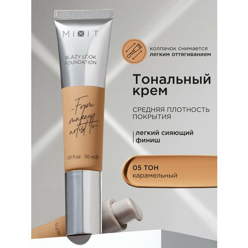 Миксит Лёгкий стойкий тональная основа для лица с эффектом сияния с тубе MakeUp Foundation Blazy Look, тон 5 имеет невесомую текстуру и создает безупречное естественное покрытие на весь день. Увлажняющая формула содержит антиоксиданты и светоотражающие частицы, которые увлажняют, выравнивают тон и преображают кожу, делая ее более свежей и отдохнувшей. Сатиновая тональная основа не забивает поры и помогает визуально выровнять текстуру лица, подходит для любого типа кожи, для очень жирной, проблемной, комбинированной, чувствительной, зрелой и возрастной. Тоналка перекрывает несовершенства кожи. Темный натуральный тональник используется для выравнивания тона и рельефа смуглой и загорелой кожи лица, помогает скрывать неровности. Оттенок caramel – карамельный. Сначала приступите к 1 этапу – средство под макияж, после нанесите выравнивающий жидкий флюид для ровного тона с тонирующим действием и спф с помощью кисти или спонжа. Результат – красивая кожа, легкий блеск и устойчивый сияющий финиш. Женская российская косметика для красоты кожи.