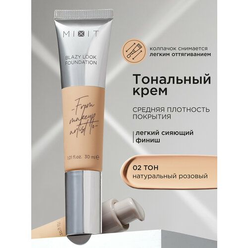Миксит Лёгкий стойкий тональный крем для лица с эффектом сияния с тубе MakeUp Foundation Blazy Look, тон 2 имеет невесомую текстуру и создает безупречное естественное покрытие на весь день. Увлажняющая формула содержит антиоксиданты и светоотражающие частицы, которые увлажняют, выравнивают тон и преображают кожу, делая ее более свежей и отдохнувшей. Сатиновая тональная основа не забивает поры и помогает визуально выровнять текстуру лица, подходит для любого типа кожи, для очень жирной, проблемной, комбинированной, чувствительной, зрелой и возрастной. Тоналка перекрывает несовершенства кожи. Натуральный светлый тональник также используется для выравнивания тона и рельефа лица, помогает скрывать неровности. Оттенок angel wing – натуральный бежевый с розовым подтоном. Сначала приступите к 1 этапу – средство под макияж, после нанесите выравнивающий жидкий флюид для ровного тона с тонирующим действием и спф с помощью кисти или спонжа. Результат – красивая и фарфоровая кожа, легкий блеск и устойчивый сияющий финиш. Женская российская косметика для красоты кожи.