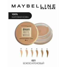 Матирующий тональный крем для лица от Мейбелен Dream Matte Mousse имеет уникальную текстуру нежного мусса. Сочетает в себе праймер и матирующую основу (2-в-1). Благодаря специальной формуле он дарит коже ровное бархатистое покрытие и надолго предотвращает появление жирного блеска. С этим уникальным тональным кремом кожа мгновенно становится безупречно матовой. Воздушное покрытие мусса создает легкий бархатный финиш. Средство легко наносится синтетической кистью или пальцами. Наносить тональный мусс можно специальной плоской кистью или кончиками пальцев. Легкими похлопывающими движениями распредели средство по коже. Тщательно растушуй покрытие на границе лица и шеи, чтобы избежать эффекта маски. Тональный мусс «Dream Matte Mousse» - это универсальное средство, сочетающее в себе легкость пудры и прекрасные укрывающие свойства крема, которое поможет вам выглядеть безупречно в течение всего дня. Тщательно выверенная формула мусса позволяет ему успешно справляться со многими несовершенствами и безукоризненно выравнивать тон, равномерно распределяясь по коже, а роскошная воздушная текстура идеально матирует, оставаясь абсолютно незаметной и придавая необыкновенную бархатистость. После нанесения лицо приобретает матовый эффект, а кожные покровы становятся нежными и бархатистыми. Для равномерного покрытия правильно наноси тональный мусс: начни распределять крем от центра лица к вискам. Особое внимание удели линии подбородка: важно чтобы тон кожи лица совпадал с тоном кожи шеи.