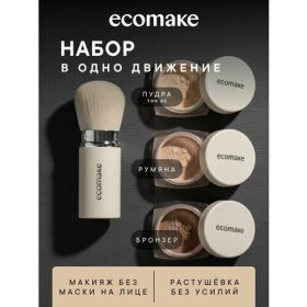 Ecomake Набор декоративной косметики 4 в1 объединяет в себе минеральную пудру, румяна, бронзер и кисть кабуки. Этот универсальный минеральный набор косметики, который позволяет создать идеальный макияж, подчеркнуть контуры лица и придать коже сияние.