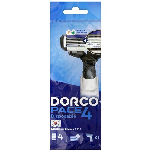 Бритвенный станок одноразовый Dorco PACE4 (1 станок), 4-лезвийный, плавающая головка, увлажняющая полоса. - Четыре лезвия обеспечивают комфортное, мягкое бритье за одно движение. - Легкое промывание всех 4 лезвий благодаря открытой архитектуре обратной стороны бреющей головки. - Специальное резиновое покрытие ручки делает бритье более комфортным. - Революционная конструкция плавающей бреющей головки идеально повторяет контуры Вашего лица, обеспечивая гладкость бритья. - Специальная увлажняющая полоска защищает Вашу кожу и уменьшает раздражение. - Резиновый микрогребень обеспечивает более чистое бритье.