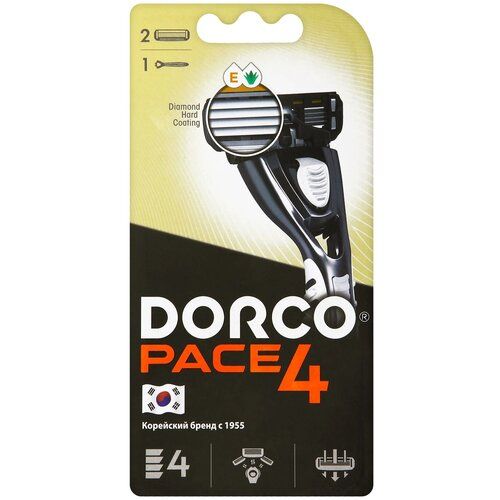 Dorco Бритва Pace4, 4-лезвийная, крепление Pace, плавающая головка, увлажняющая полоса (1 станок, 2 кассеты). - Идеально подходит для 3-х дневной щетины 4 лезвия обеспечивают превосходный результат за одно движение. - Расположение лезвий позволяет им практически не забиваться. - Легкое промывание благодаря открытой архитектуре обратной стороны картриджа. - Смазывающая полоска с экстрактами Алоэ, Лаванды и Витамином Е увлажняет и успокаивает кожу. - Резиновый микрогребень позволяет значительно глубже сбривать волоски. - Плавающая бреющая головка идеально повторяет контуры, обеспечивая гладкое бритье. - Специальное резиновое покрытие металлической ручки делает бритье комфортным и уверенным. В упаковке 1 бритвенный станок и 2 сменные кассеты.