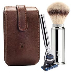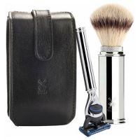 Более компактные и легкие по весу дорожные наборы для бритья ничуть не менее функциональны, чем стандартные наборы MUHLE. Помазок помещается в тубус с помощью удобного поворотного механизма и закрывается колпачком из хромированного металла, что отлично защищает его в дороге. Кисть помазка в дорожных наборах делается только из фибры Silvertip – самой быстросохнущей и очень износостойкой. Чехол ручной работы из черной или коричневой кожи, исполненный во флорентийском стиле, плотно вмещает бритву и помазок.