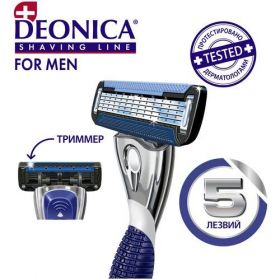 Бритва для мужчин, Deonica for men с пятью лезвиями с двойным керамическим покрытием, изготовлена в США. Смазывающая полоска с экстрактом алоэ-вера, маслами позволяет уменьшить раздражение кожи при бритье. При ежедневном использовании бритвенного станка, кассеты следует менять раз в 2 недели. Плавающая головка бритвы Deonica позволяет сбрить мелкие волоски на лице. При бритье бороды, усов, ног, рук, для интимной гигиены вместе со средствами для бритья Deonica (гель и пена) процедура удаления волос проходит комфортнее, а средства после бритья (крем, лосьон, бальзам) помогут продлить ощущение гладкости. На другой стороне кассеты имеется лезвие триммер для точного бритья. Для бритвы мужской деоника подойдут любые сменные кассеты Deonica. Металлическая ручка с вставками позволяет комфортно расположить бритву в руке. Бритву мужскую можно скомпоновать со средствами для и после бритья и подарить папе, мужу, сыну, брату или коллеге на новый год, 14 февраля, 23 февраля и на день рождения.