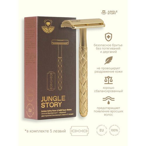 Безопасный бритвенный T-образный станок Jungle Story Золотой в подарочной картонной коробке на магните с 5 сменными лезвиями.