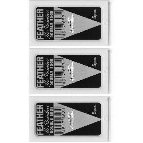 - Набор содержит 3 диспенсера с 15 лезвиями Feather в черной упаковке.