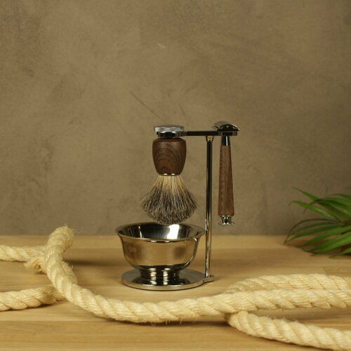 НАЙТИ ВЫГОДНЕЕ - Подарочный набор для бритья 4 предмета, Т образная бритва с деревянной рукояткой, Помазок натуральный барсучий ворс, Держатель, чаша для взбивания пены