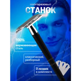 Головка бритвы разборная и выполнена из нержавеющей стали. Ручка станка - прочный пластик. В комполекте с Т- образной бритвой идут 3 сменных лезвия из нержавеющей стали. Универсальный дизайн черный и серебристый цвет. Удобная в эксплуатации разборная конструкция позволяет использовать станок как бритву женскую или бритву мужскую. Закрытая конструкция головки безопасной бритвы позволяет максимально использовать остроту лезвия. Съемная ручка многоразовой бритвы имеет ребристую поверхность, что минимизирует скольжение бритвы в руке и делает процесс бритья более комфортным. Данный вариант подходит для бритья лица, подмышечных впадин, зоны бикини и ног.