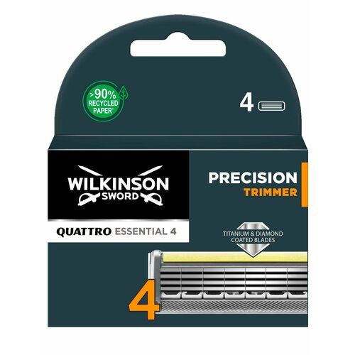 НАЙТИ ВЫГОДНЕЕ - Wilkinson Sword Сменные кассеты QUATTRO Titanium Essential Precision (4 шт.), 4 лезвия + лезвие-триммер, увл. полоска