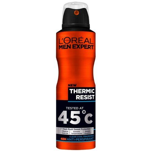 Спрей-антиперспирант L'Oréal Men Expert Thermic Resist с термостойкими свойствами и свежим ароматом помогает бороться с неприятным запахом и потоотделением. Высокоэффективный антиперспирант, эффективный даже при экстремальных температурах (45°C).