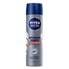 Дезодорант-антиперспирант спрей NIVEA MEN СЕРЕБРЯНАЯ ЗАЩИТА с уникальной антибактериальной формулой с ионами серебра для защиты от пота и запаха на 99,9%*. Ни один другой драгоценный металл не обладает столь сильными антибактериальными и противовоспалительными свойствами, как серебро. Кроме антибактериального эффекта, продукт успокаивает кожу и имеет свежий мужской аромат. Не содержит спирта и подходит даже для очень чувствительной кожи. Обеспечит вас надежной защитой от пота и неприятного запаха на срок до 48 часов. Применение: хорошо встряхнуть перед использованием. Распылять в области подмышек с расстояния 15 см. Дать полностью высохнуть во избежание образования пятен на одежде. *Тест in-vitro на содержание бакретий Corynebacterium Xerosis и Staphylococcus Epidermidi через 30 секунд после использования антиперспиранта.
