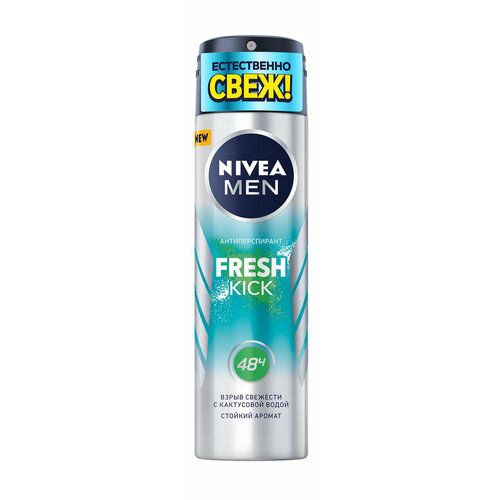 Ощутите взрыв свежести вместе с новым антиперспирантом Nivea men fresh kick с кактусовой водой в стильном дизайне в формате спрея. Антиперспирант подарит вам чувство бодрящей свежести, стойкий аромат и надежную защиту от пота и запаха на протяжении 48 часов. Новый Nivea men fresh kick обеспечивает не только свежесть, а также уверенность и комфорт на весь день. Необычным компонентом нового антиперспиранта является кактусовая вода, которая вместе с другими ингредиентами дает ощущение свежести от Nivea men fresh kick как после душа в жаркий день