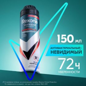 Дезодорант мужской спрей антиперспирант Рексона Антибактериальный и невидимый на черной и белой одежде, 150 мл