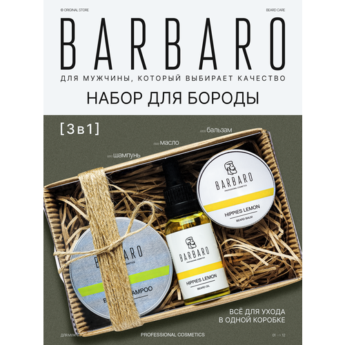 Набор для ухода за бородой и усами Barbaro включает в себя твердый шампунь, масло и бальзам. Все средства изготовлены из натуральных ингредиентов и предназначены для комплексного ухода за бородой и усами.